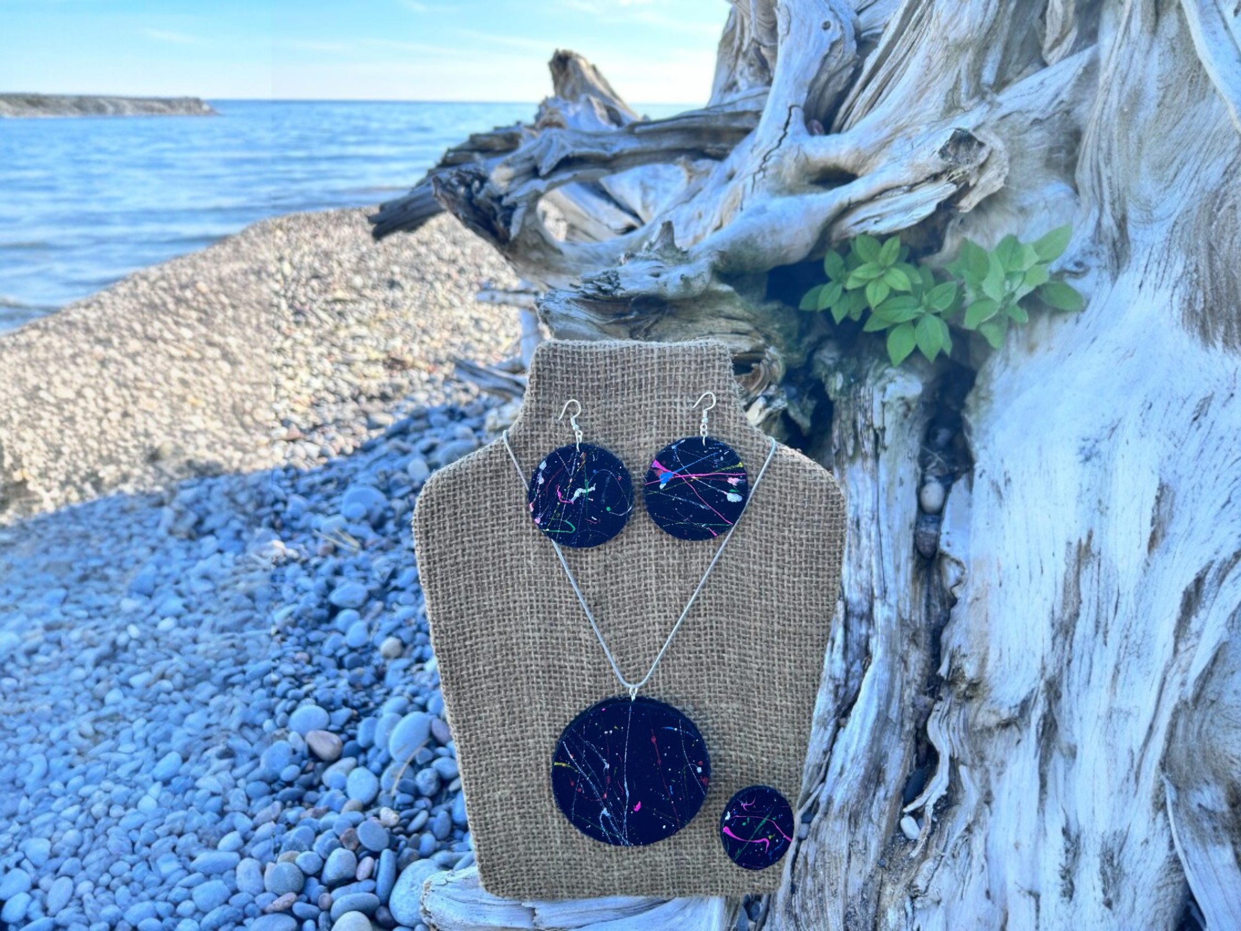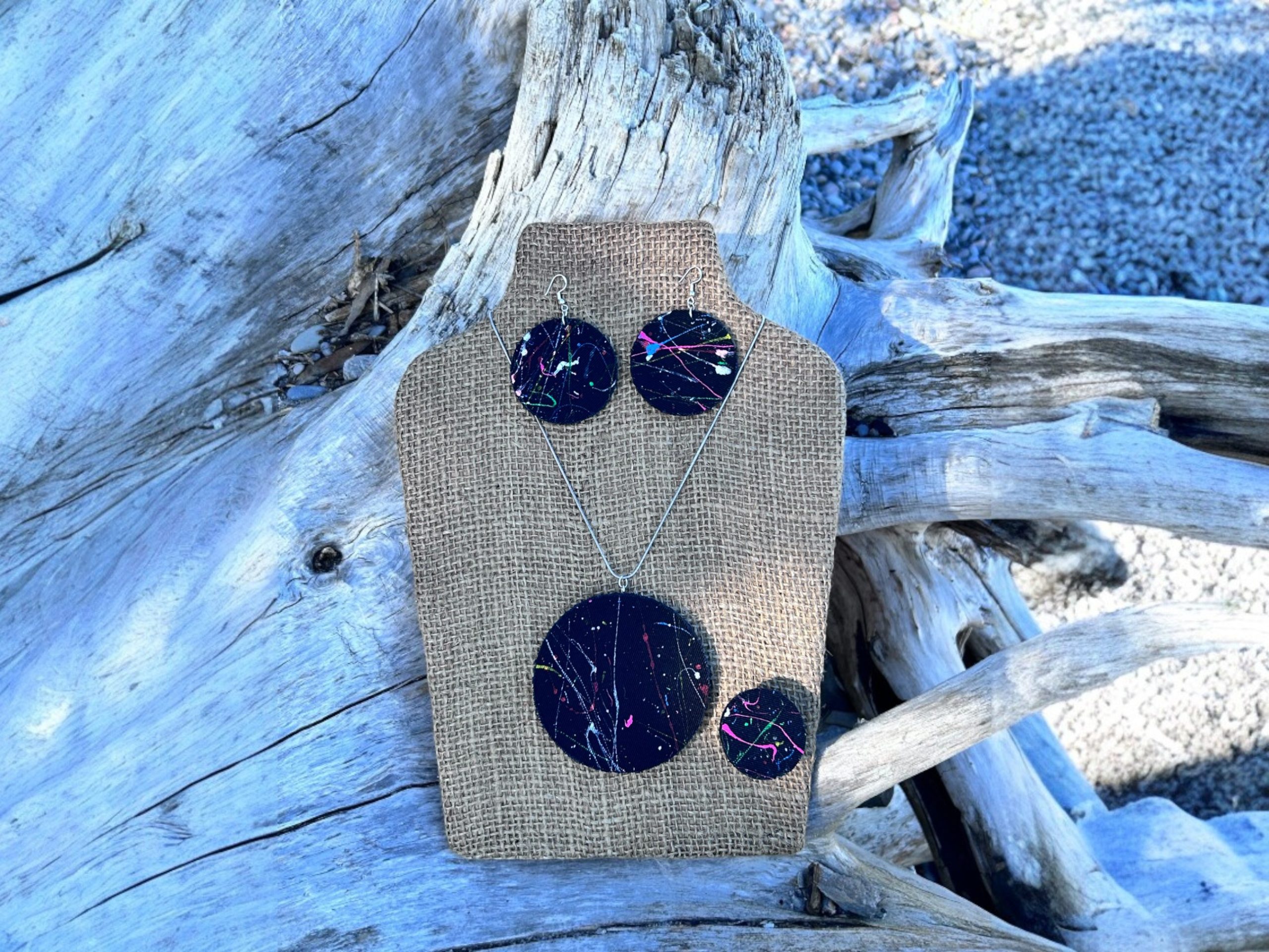 Playful minimalism meets eco-chic! This handcrafted denim earrings set features black circular studs in varying sizes displayed on a natural wooden holder.